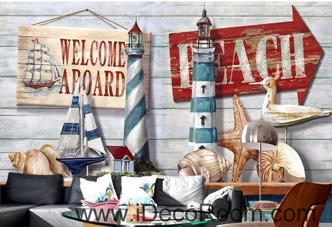 Retro Light House Sail Boat Shell Beach IDCWP-000069 Wallpaper Wall Decals Wall Art Print Mural Home Decor Gift
