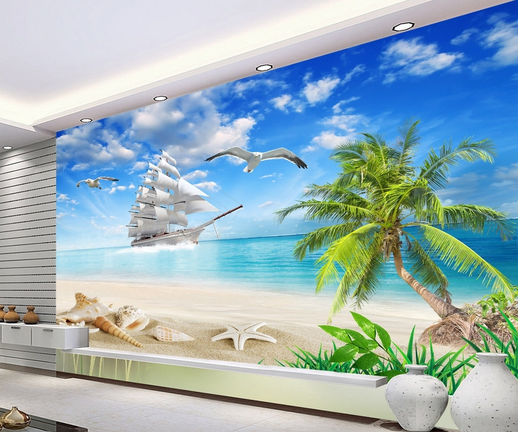 seascape beach coconut tree sailing Wallpaper IDCWP-DZ-000135