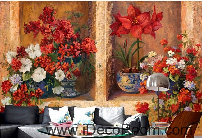 Beautiful dream gorgeous blooming red flower pots oil painting effect wall art wall decor mural wallpaper wall IDCWP-000089