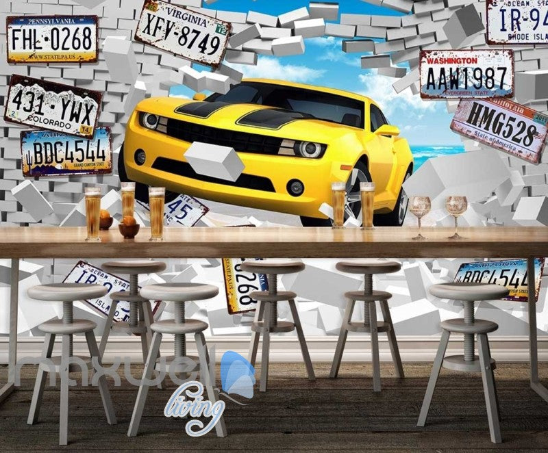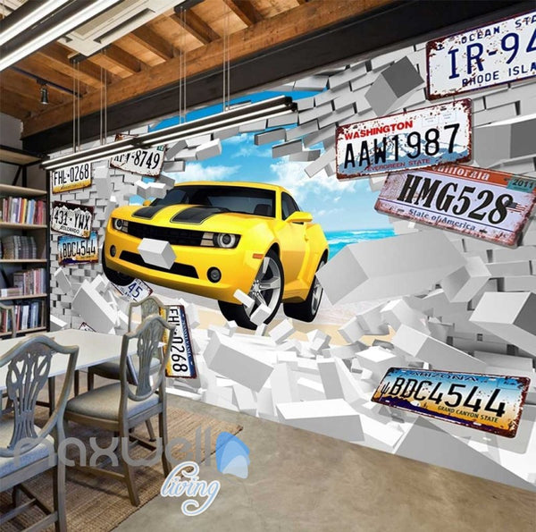 Breaking Through Wall Yellow Car Car Plates Art Wall Murals Wallpaper Decals Prints Decor IDCWP-JB-000859