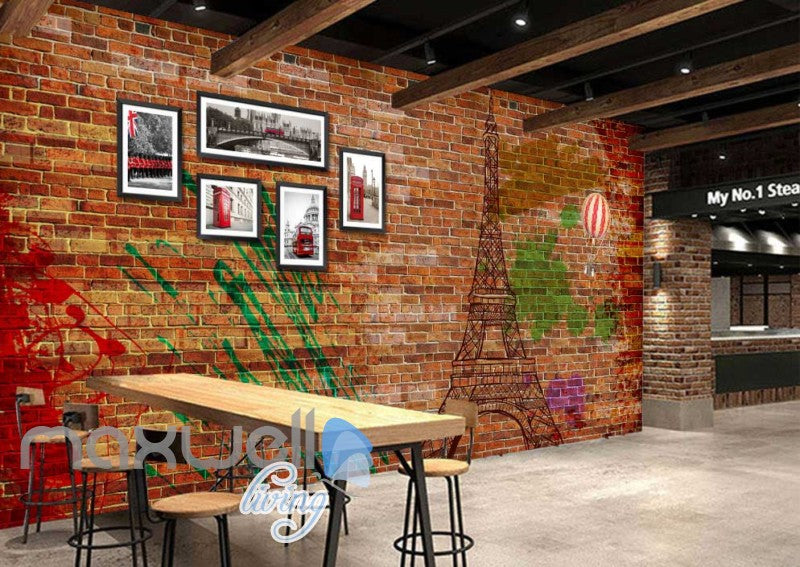 Brick Wall With Eiffel Tower And London Photographs Art Wall Murals Wallpaper Decals Prints Decor IDCWP-JB-000706