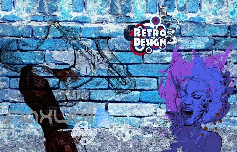 graphic wallpaper design of retro woman on a blue brick wall Art Wall Murals Wallpaper Decals Prints Decor IDCWP-JB-000564
