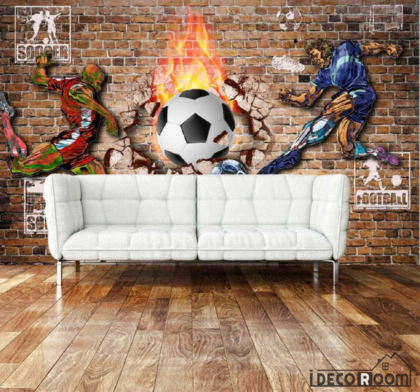 Red Brick Wall 3D Graphic Design Football Players Fire Ball Breaking Through Wall Living Room Art Wall Murals Wallpaper Decals Prints Decor IDCWP-JB-001109