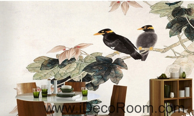 Retro Begonia Flower Tree on a pair of bird magpie oil painting effect wall art wall decor mural wallpaper wall IDCWP-000242