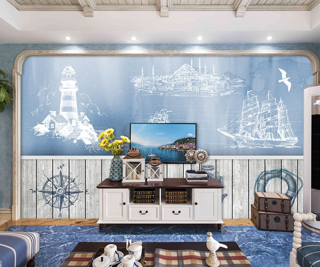 Sea sailing hand-painted wall painting Mediterranean mural Wallpaper IDCWP-DZ-000228