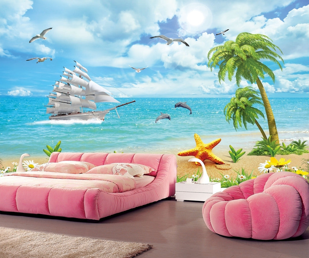 Seascape Landscape Coconut Tree Sailing Living Room Wallpaper IDCWP-DZ-000120