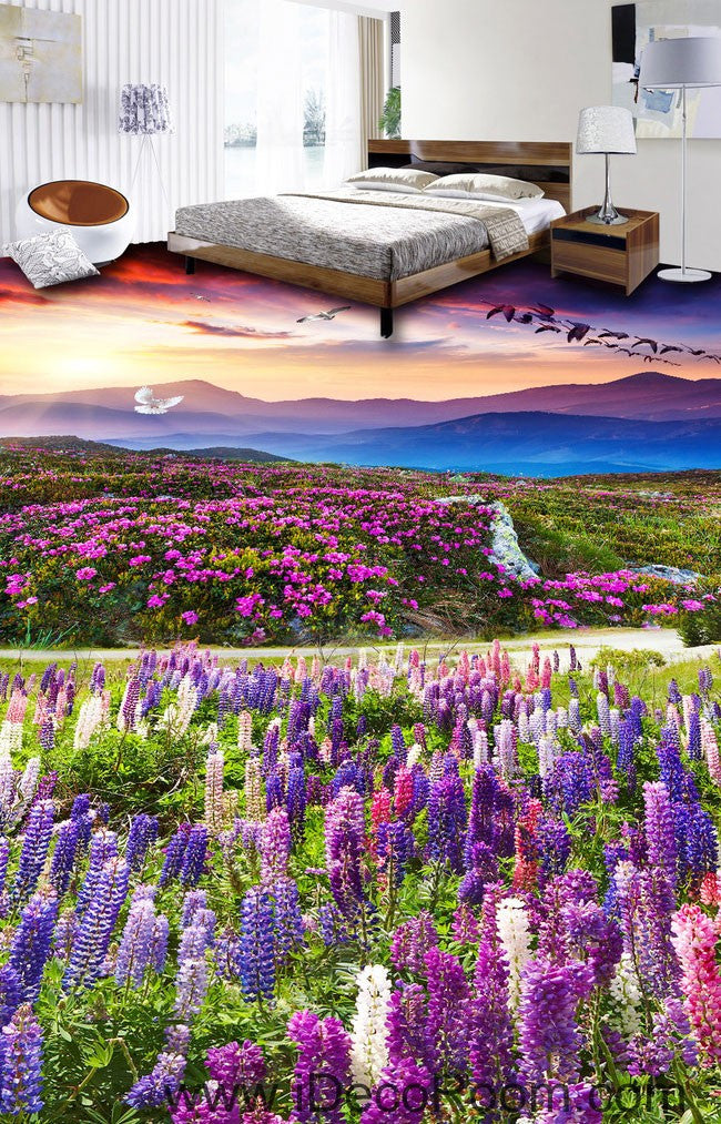 Sunset Mountain Purple Lavender Flowers 00087 Floor Decals 3D Wallpaper Wall Mural Stickers Print Art Bathroom Decor Living Room Kitchen Waterproof Business Home Office Gift