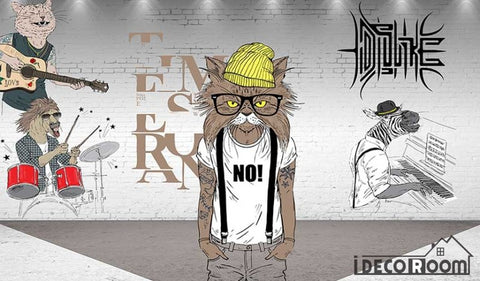White Brick Wall 3D Hipster Animals Playing Instruments Living Room Restaurant Art Wall Murals Wallpaper Decals Prints Decor IDCWP-JB-001101