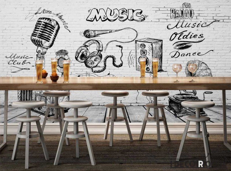 White Brick Wall Black And White Drawing Music Restaurant Bar Art Wall Murals Wallpaper Decals Prints Decor IDCWP-JB-001237