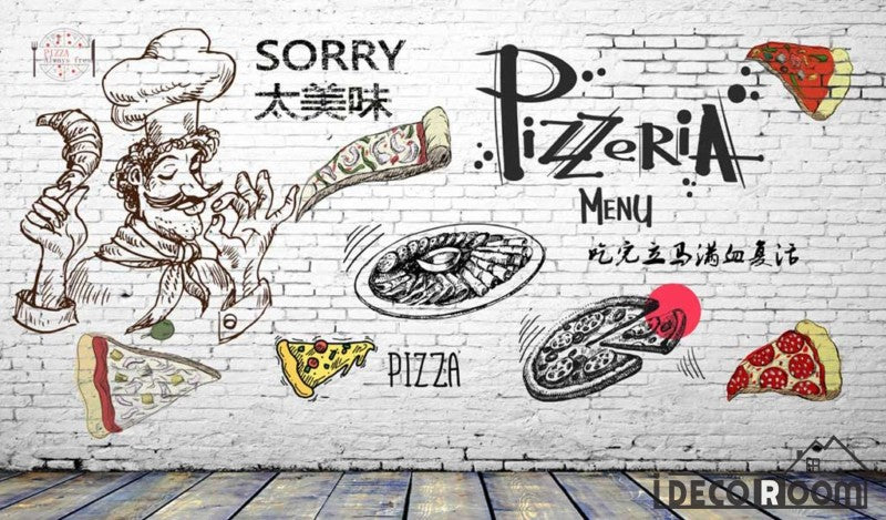 White Brick Wall Black And White Drawing Pizza Pizzeria Restaurant Art Wall Murals Wallpaper Decals Prints Decor IDCWP-JB-001239